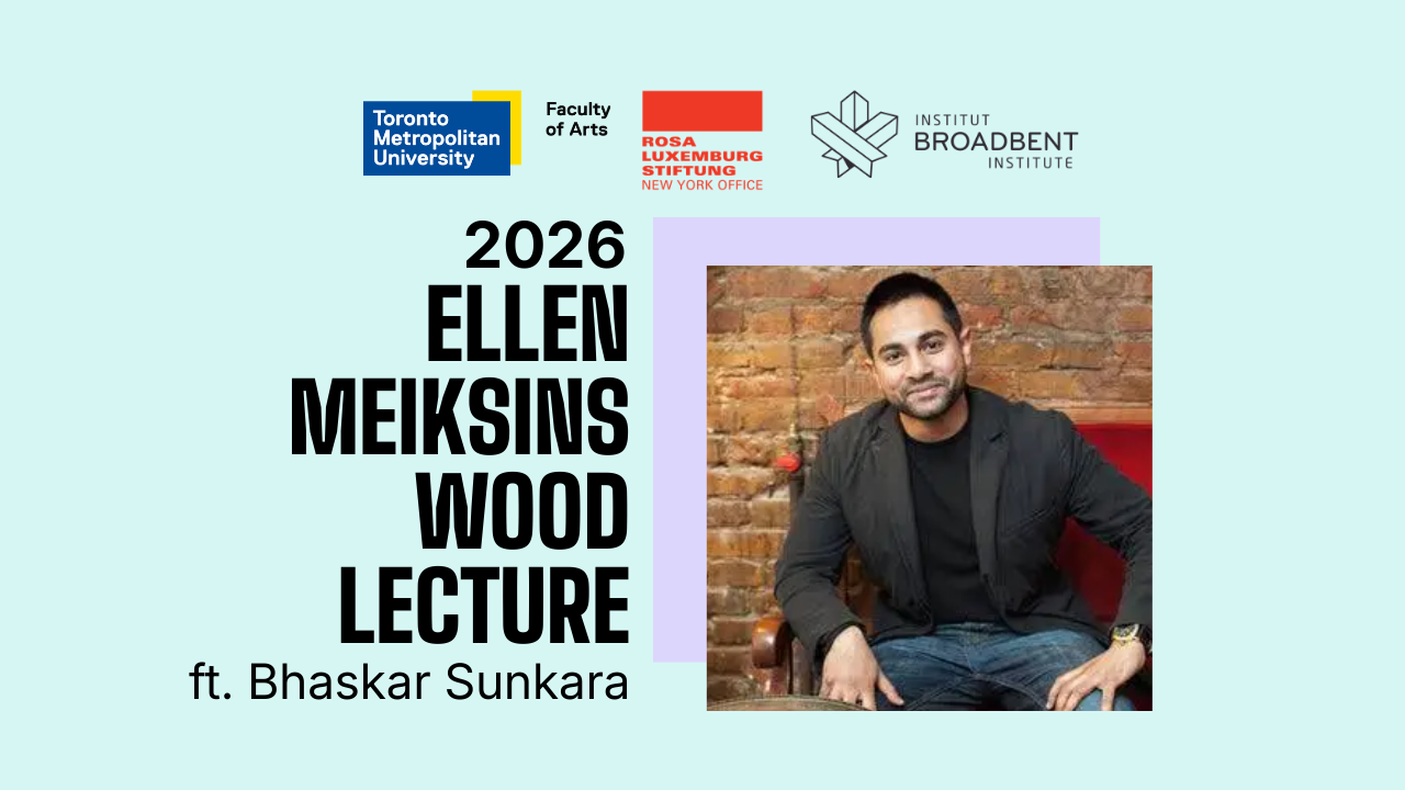 We invite you to join us on Wednesday, April 22 for the 2026 Ellen Meiksins Wood Lecture, delivered by Bhaskar Sunkara, at Toronto Metropolitan University, at the Sears Atrium (3rd Floor, George Vari Engineering and Computing Centre), starting at 6pm EDT, followed by a reception with light refreshments. The event is hosted by Toronto Metropolitan University, Faculty of Arts and is sponsored this year by the Rosa Luxemburg Stiftung – New York Office.