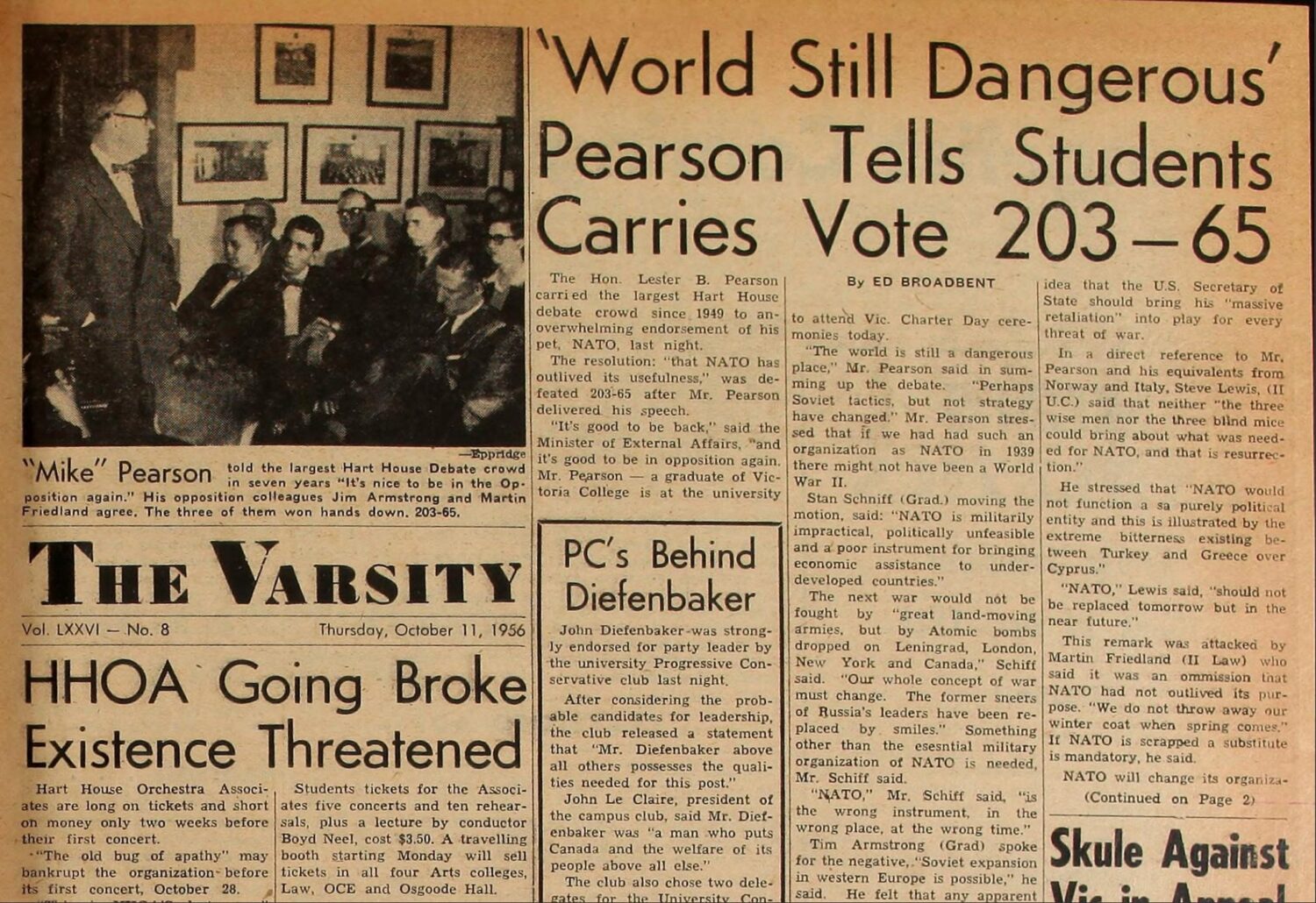 His first published writing on a question related to foreign policy I’ve been able to find comes in the form of a report,1 written in October 1956 while Ed was an undergraduate at the University of Toronto, for its student newspaper The Varsity (incidentally where I got my start as a writer). The occasion for that report was a debate held at Hart House about Canada’s membership in NATO in which Lester B. Pearson faced off against a quite precocious second year student from University College by the name of Stephen Lewis.