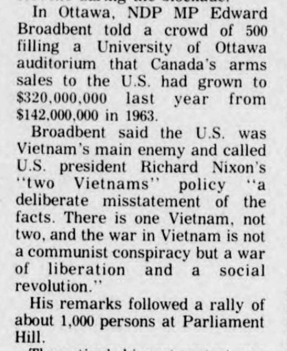 But it was in the 1960s that Ed Broadbent’s ideas about the world really began to take shape. This, after all, was the decade of Paris ‘68, of the New Left, the civil rights movement; of growing global protests against the American war in Vietnam; and, here in Canada, of the Bomarc Missile Crisis, the Waffle, and the Quiet Revolution. And Ed — who in those days sported a leather jacket, drove a motorcycle, and was described in 1967 by one student journalist as a “button-wearing Vietnik” — fit right in. Helping to organize protests against the war in Vietnam while a professor of political science at York, he soon carried his antiwar activism into Parliament. As a keynote speaker at Ottawa’s 1969 Moratorium Day protest, Ed had harsh words for US president Richard Nixon, remarking “[That] the main enemy of the people of Vietnam” was not a communist conspiracy but the military superpower to the south of us.”